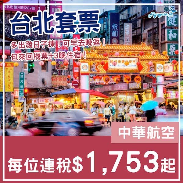 【台北】出發日子選擇多!可早去晚返!台北4日3夜套票,包來回機票+3晚住宿,每人連稅$1,753起!8月中至12月尾出發