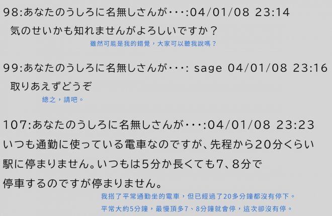 葉純心裡發毛,登上2Channel的「怪事實況報導」討論串求助。根據《Kowabana》網站,她描述車廂內只有五名乘客,全睡得像石頭,怎麼喊都不醒!