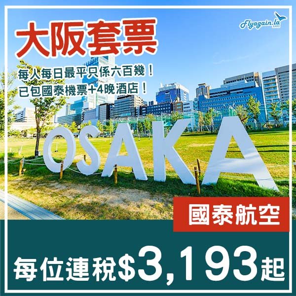 【大阪】又抵玩咗!大阪5日4夜套票,包國泰來回機票+4晚酒店,每位連稅$3,193起!9月至11月指定日子出發