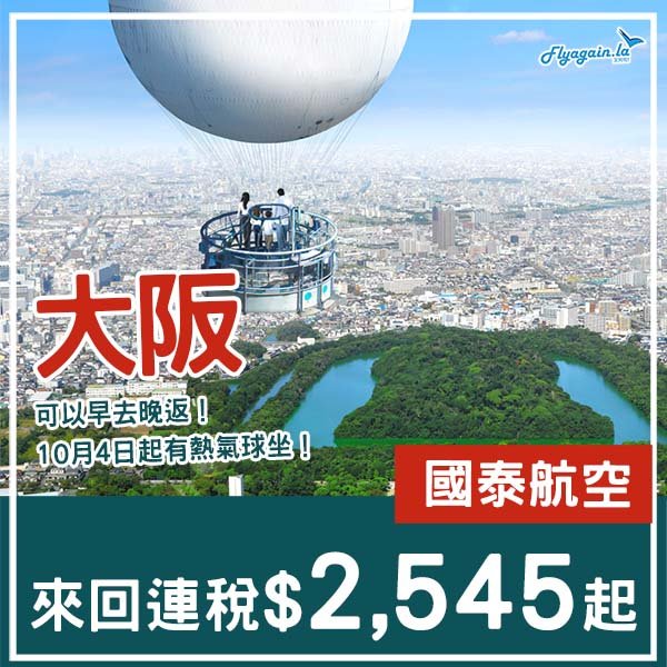 【大阪】潮玩熱氣球!可早去晚返!國泰航空來回大阪連稅$2,545起!9月至12月指定日子出發