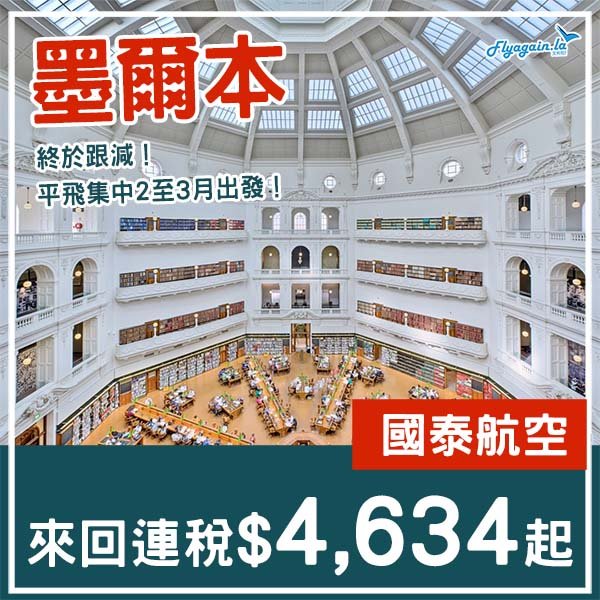 【墨爾本】終於跟減啦!國泰航空來回墨爾本連稅$4,634起!12月至2026年3月指定日子出發