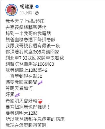 楊繡惠今天(1日)直播說,原本自己在嘉義工作,結果錄影到一半接到哥哥的電話,告知爸爸的狀況,緊張得趕快搭高鐵北上。而當時的狀況是阿西前一天的下午3點開始,血糖一直都很低,後來想上廁所結果全身癱軟,血糖一測竟剩下40,趕快送往急診室。雖然後來血糖有回升,但是狀況依然不是太好,還在醫院觀察。