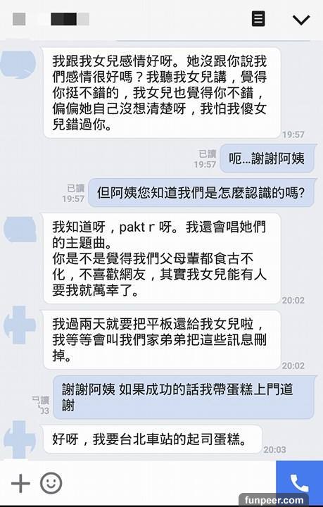 ▼媽媽表明了自己的身份後,還非常開明地鼓勵男方親自去跟女兒告白,因為了解女兒的她不想「我的傻女兒錯過了你」,甚至還約定男方到時追到女兒後要請吃「台北車站的起司蛋糕」。