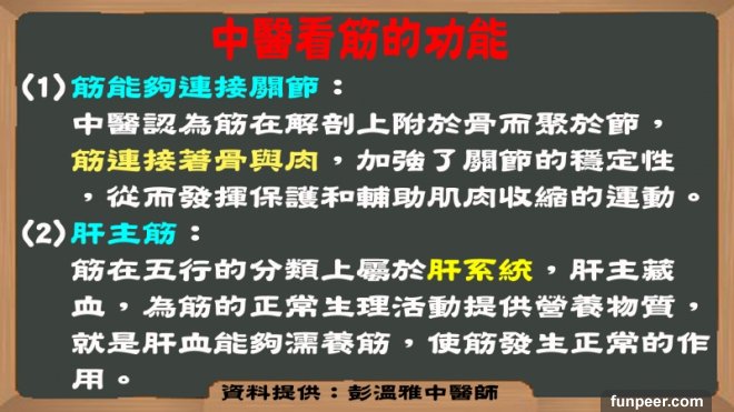 筋的主要生理功能(1) 筋能夠連接關節:中醫認為筋在解剖上附於骨而聚於節,筋連接著骨與肉,加強了關節的穩定性,從而發揮保護和輔助肌肉收縮的運動。(2) 肝主筋:筋在五行的分類上屬於肝系統,肝主藏血,為筋的正常生理活動提供營養物質,就是肝血能夠濡養筋,使筋發生正常的作用。