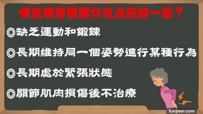 ◆壞習慣讓你筋縮又老化?!在中國民間,有許多俗語,也能說明「筋長」與「健康」和「壽命」的緊密關係,所以筋縮就是筋的縮短,因而令活動受限。每個人身上都有一條大筋,從頸部開始引向背部,經腰、大腿、小腿、腳跟至腳心。解剖學裡沒有提及這條大筋,它就像經絡穴位,並無有形的位置,但當你接受治療時,就體會到這條筋的存在。我們身體裡面的筋需要經常活動,也就是伸拉,才能保持伸縮力、彈性,防止老化。如果筋失去了活動的機會的話,那麼筋縮就會發生。筋縮原因:(1)上班族久坐電腦桌前(2)生活節奏加快(3)交通便利:出門坐車乘電梯,回到家就在電視或電腦前一坐,缺少筋骨的鍛煉。