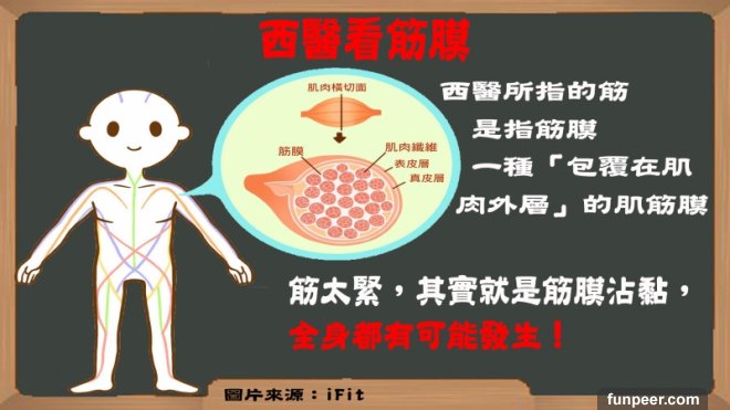 西醫所指的筋是指筋膜,一種「包覆在肌肉外層」的肌筋膜,筋太緊 其實就是筋膜沾黏,而筋膜「沾黏」發生的部位,全身都有可能。