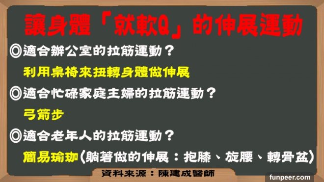 適合辦公室的拉筋運動:利用桌椅來扭轉身體,每隔二小時,就應起來活動一下,做五分鐘的伸展操。盡量不要維持固定姿勢太久,還可以有打斷疲乏的效果。
