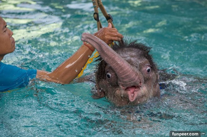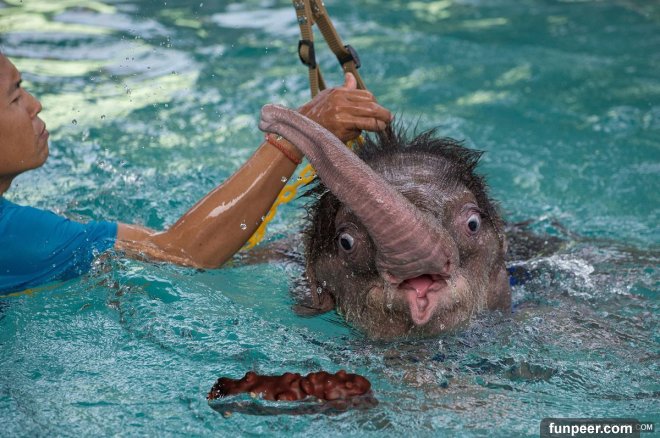 最近,一張小象游泳的照片在網路上紅了起來!這是一頭不慎踩到捕獸夾截肢的小象,獸醫為了避免牠有陰影不敢行走,所以讓牠到芭達雅一處康復中心進行水療。但小象第一次進入水中,卻被拍下這張露出驚恐表情的照片。