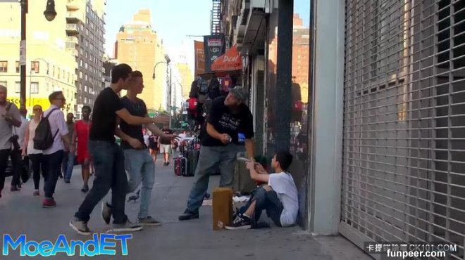 MoeAndET被這位遊民的舉動感動,並表示要將少年乞討到的所有錢都給遊民,遊民又震驚又高興,不斷向他們道謝。他們還另外拿了兩百塊美金(約新台幣六千多元)給他,希望他去買些食物或找個地方住。