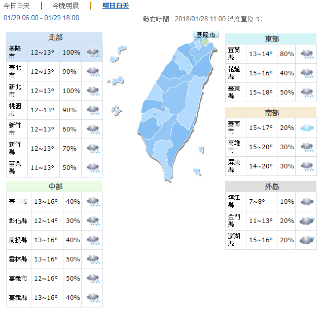 ▼明天全台各地都是濕冷天氣,高溫幾乎都在20度以下。圖/中央氣象局