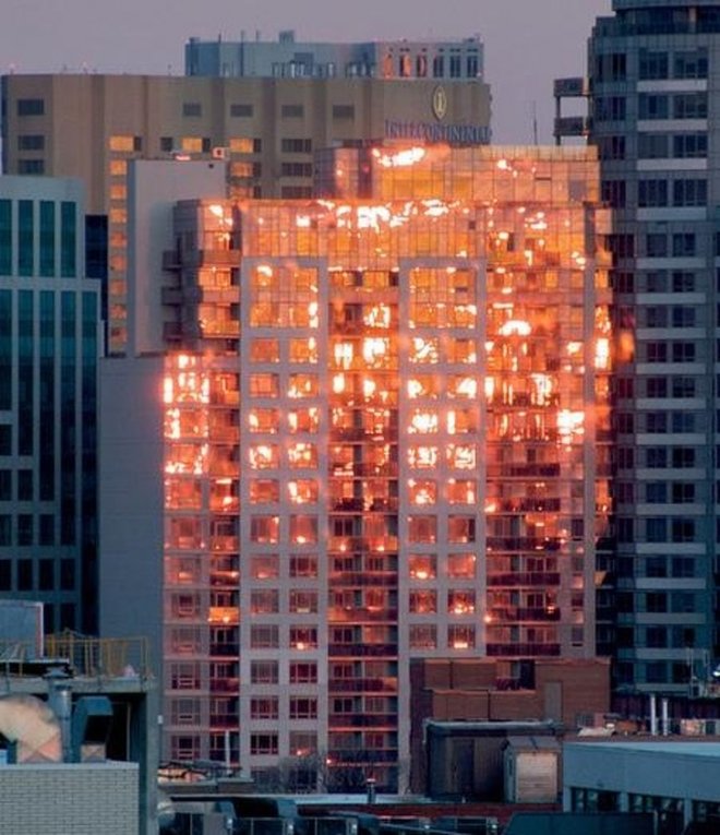 ▼這棟大廈沒有著火,那是夕陽的餘暉。