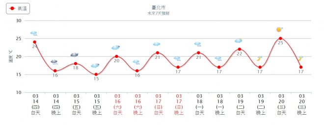 氣象局表示,周五(15日)至周六(16日)鋒面過後,全台天氣轉乾,僅有位在迎風面的北部、東北部及中南部山區還會有短暫陣雨,北部濕冷天氣恐怕將持續到下周二才會轉乾,氣溫才會逐漸回升,其他地區皆為多雲到晴的好天氣,不過周日(17日)受到華南水氣東移影響,中部以北及東北部地區恐怕又將降雨,花東地區及南部地區也有發生短暫雨的可能,提醒民眾出門準備好雨具,以備不時之需。