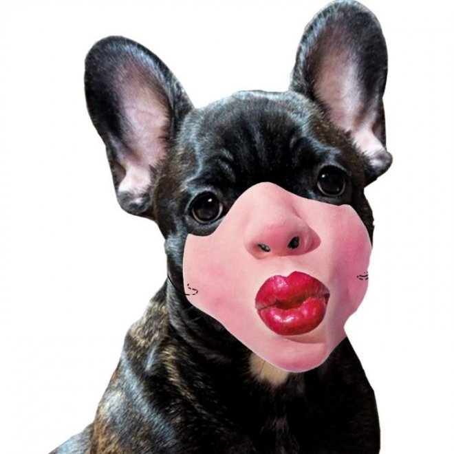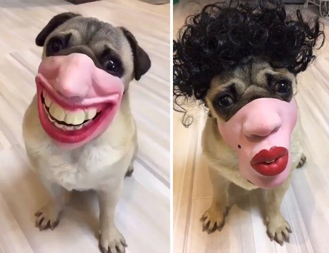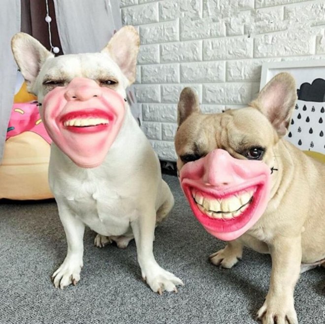 ▼這些嘴套模仿了人類的口鼻部位,同時做出各種誇張的表情,搭配狗狗的臉,帶來了一種超詭異的喜感!