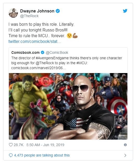▼巨石強森得知羅素兄弟的回答後非常開心,不僅在推特上分享這則新聞,還說:「我天生就該飾演這個角色!我今晚會跟你們聯絡的,羅素兄弟!是時候稱霸漫威宇宙了!」