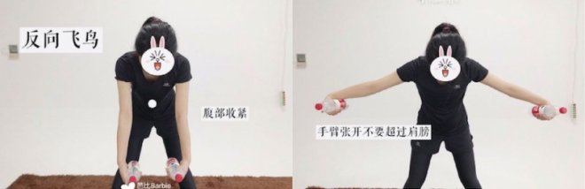 這個動作其實是重訓中「反向飛鳥」的簡易變化版本,如果想嘗試增加負重的女孩,我們也可以將空手合掌改為手握裝水寶特瓶,來更快地跟蝴蝶袖說掰掰唷~