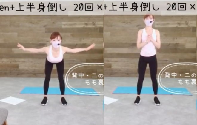 STEP2:雙手張開時,背部打直身體向前傾;合掌時收回雙臂與身體,並回到站姿再重複動作。
