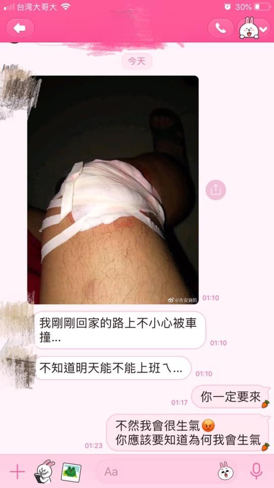 沒想到就在禮拜六深夜,一名工讀生突然傳LINE要臨時請假,表示自己「回家路上被撞,明天可能無法上班....」