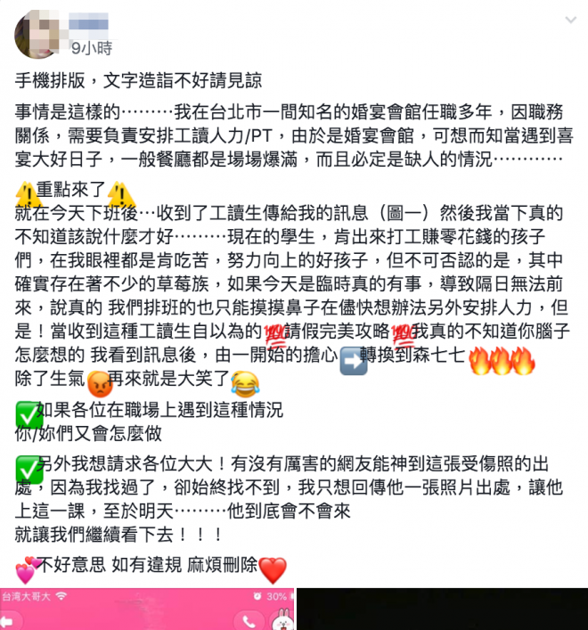 女網友表示她在知名婚宴會館工作多年「因職務關係,需要負責安排工讀人力/PT,