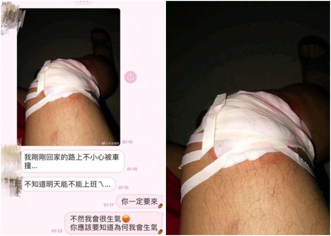 工讀生附上一張受傷的照片,乍看膝蓋受傷包紮,但