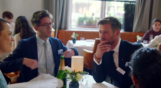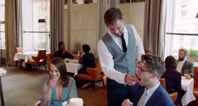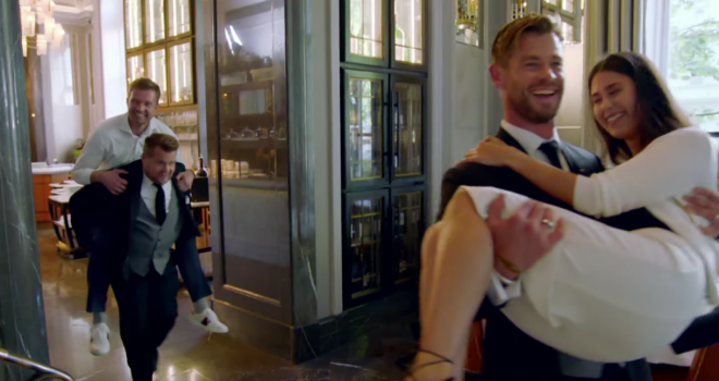 澳洲35歲男演員克里斯漢斯沃(Chris Hemsworth)因演出漫威超級英雄「雷神索爾」而走紅,全世界都有很多粉絲。他最近為了宣傳新電影《MIB星際戰警:跨國行動》,特別上了名主持人詹姆斯柯登(James Corden)的節目,兩人在英國倫敦的 The Northall 餐廳化身黑西裝服務生,過程超搞笑!