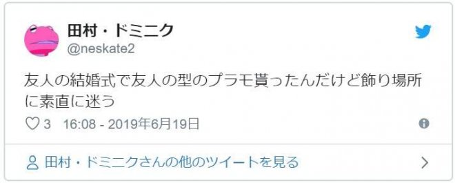 ▼不得不說,這位推主的腦洞真的很大。但拿到模型的賓客是怎麼想的呢?一位朋友挖苦說:「朋友婚禮上拿到的模型,但老實說根本不知道該擺在哪裡啊。」