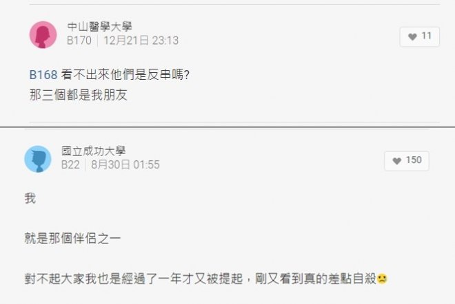 但也有一名女網友跳出來打臉,「看不出來他們是反串嗎?那3個是我朋友」。據了解,此事件早在今年8月29日時就被爆出,還有一名男網友說,「我,就是那個伴侶之一,對不起大家我也是經過一年才又被提及,剛又看到真的差點自殺」。