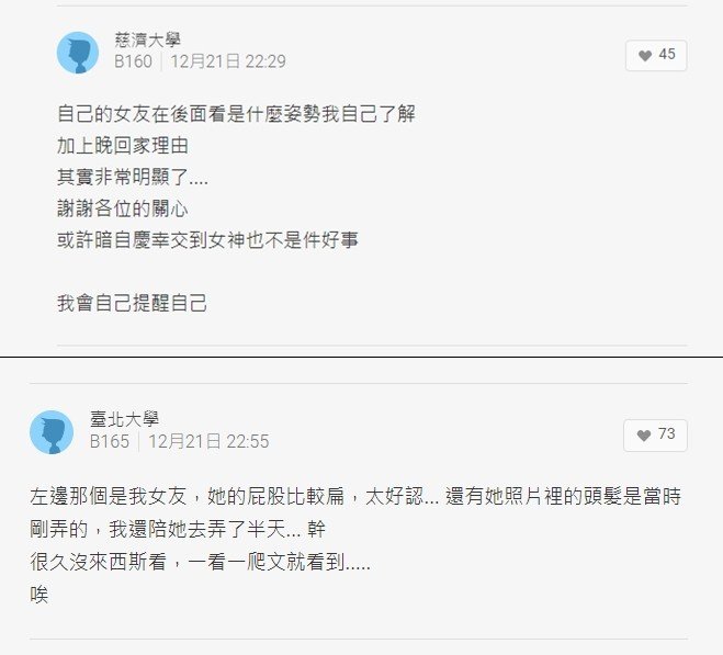 事件越演越烈,許多「綠帽男友」也紛紛現身回應,「自己的女友在後面看是什麼姿勢我自己了解,加上晚回家理由其實非常明顯了….謝謝各位的關心或許暗自慶幸交到女神也不是件好事,我會自己提醒自己」;「左邊那個是我女友,她的屁股比較扁,太好認…還有她照片裡的頭髮是當時剛弄得,我還陪她去弄了半天…X」。