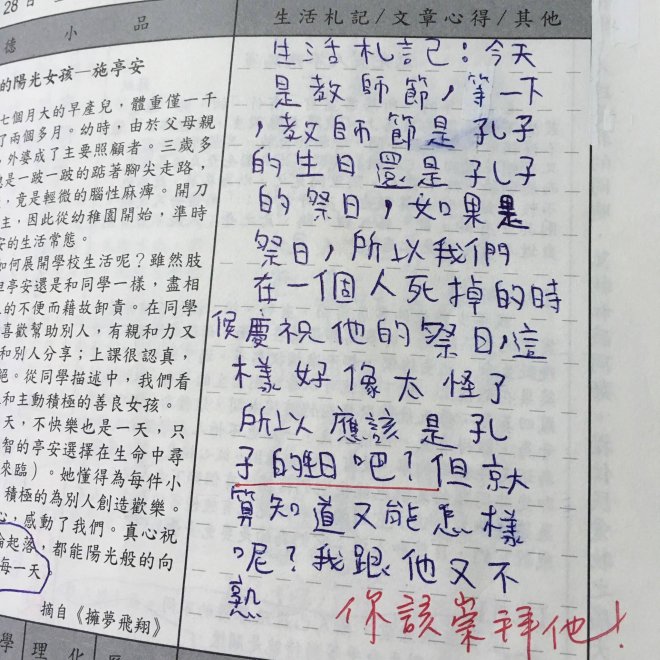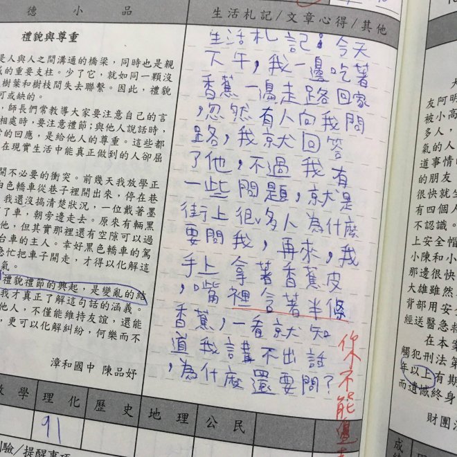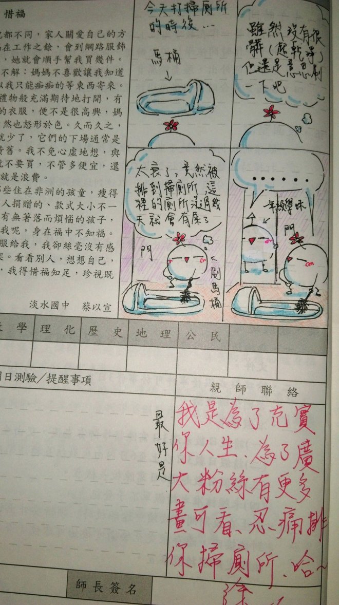 史上最讓人想一直讀下去的聯絡簿!就讀中華大學的女網友覺得國三弟弟寫的生活札記很好笑,於是決定把聯絡簿的內容上傳到網路給大家看,沒想到還真的引起大家的注意!什麼「因為天氣很冷,那邊就會變小,我是說膽子」、「今天我媽把仙草跟奶茶混在一起,喝起來就跟把奶茶和仙草混在一起的味道一樣」,每一句都超有梗,害大家都笑到並軌!