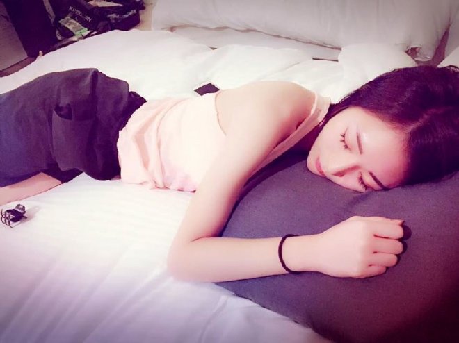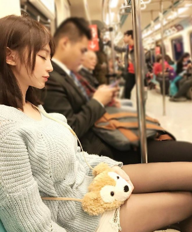 工作比較繁忙,在坐地鐵上班的時她抓緊時間小息一會,美麗的身材引起無數乘客側目。