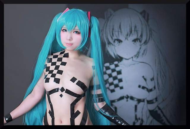 也馬上拍了一組繪師「雪月佳」所繪製的初音穿著膠帶比基尼Cosplay照片
