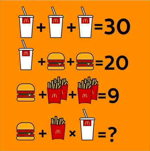 最近網路上瘋傳一則麥當勞數學題,超多網友都答錯啦!!!以下是問題:3杯飲料相加等於30,1杯飲料加兩個漢堡等於20,1個漢堡加4包薯條等於9,那1個漢堡加1包薯條乘以1杯飲料等於多少錢? 有很多網友答案都超展開~~算好了嗎?公佈答案囉!。...