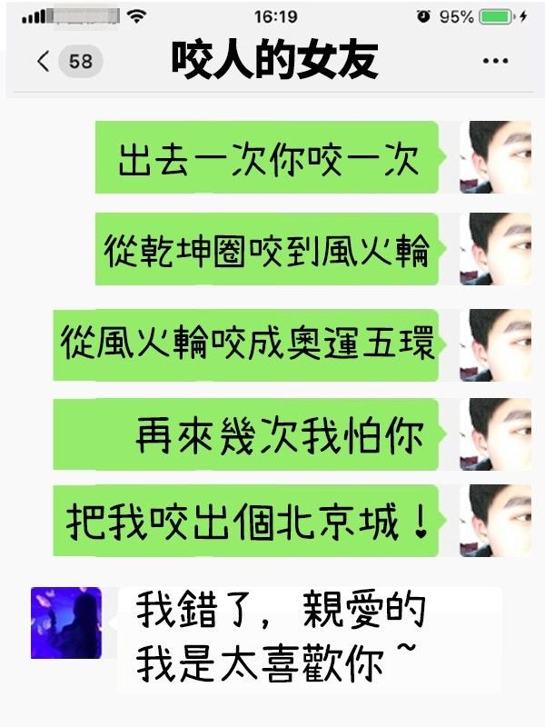 逼得他動怒,女友對他為何不願意外出應該心裡有數,更傳手臂被咬的照片,「出去一次你咬我一次」、「從乾坤圈咬到風火輪,又從風火輪咬成了奧運五環,再來幾次我怕你給我咬出一個北京城!」諷刺已經到了害怕的地步。▼
