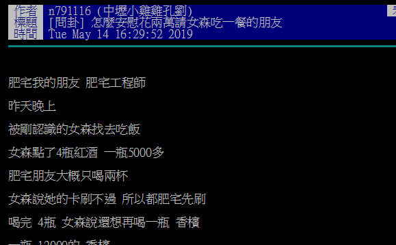 一位網友在批踢踢上問掛:「怎麼安慰花兩萬請女森吃一餐的朋友?」
