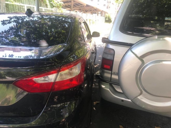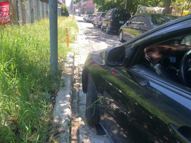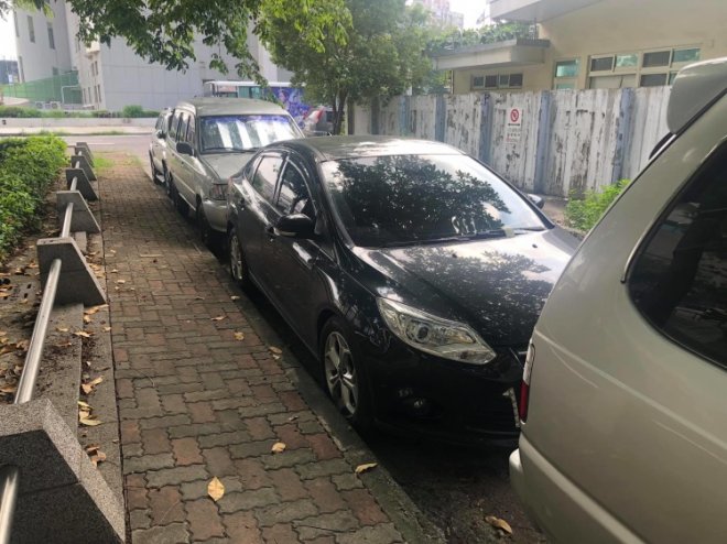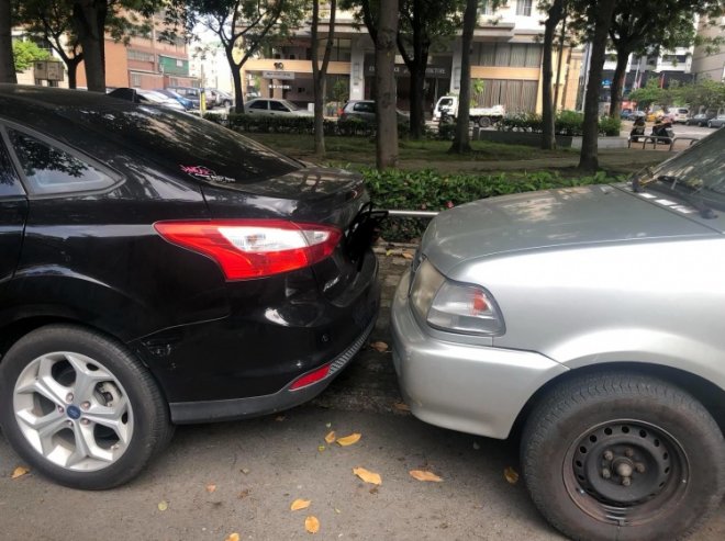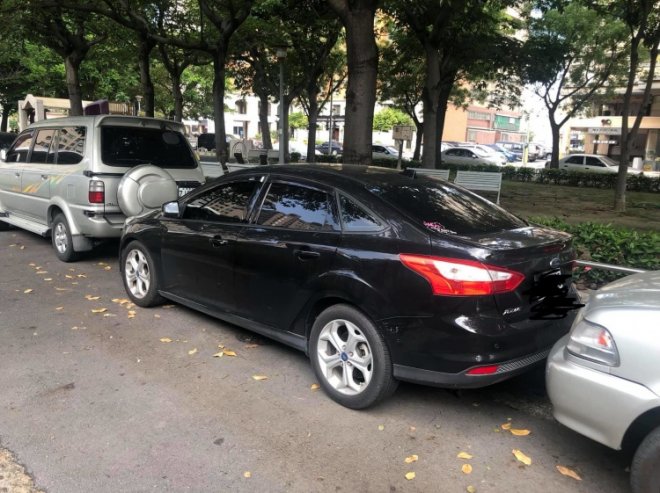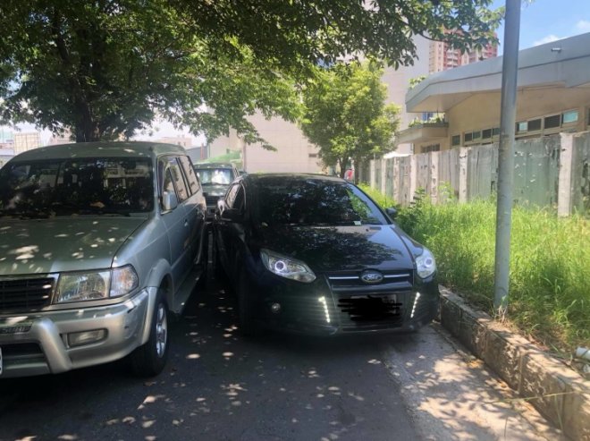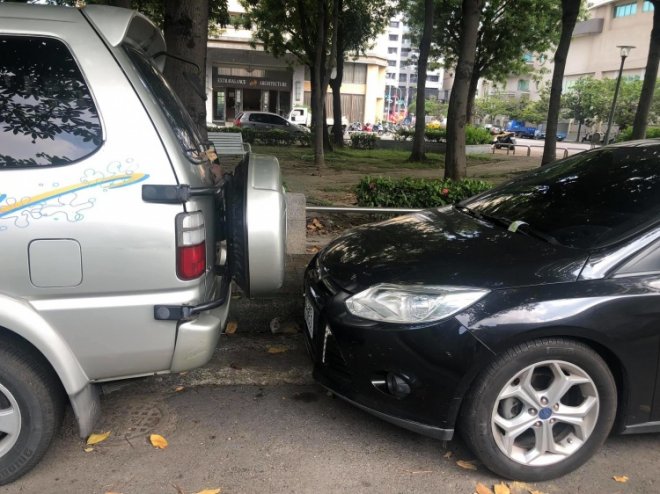 忘了說明,這個路邊停車位置不但超級小,這條路還是個窄巷,旁邊停了一排車之後,狹路頂多只能供一台休旅車超慢速經過而已。就等著看她要怎麼出來?車子就算斜出來也需要空間的耶~