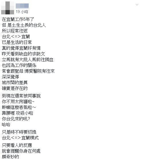「只要看人的反應,就會提醒你身在何處。」原PO提到,因為他經常往返宜蘭、台北兩地,在宜蘭,身邊的人不時就會爆出「靠腰喔、攻殺小」這樣的口頭禪,與在台北的感受不同,所以覺得滿奇妙的。有趣的是,這篇文章一PO出隨即引發其他網友共鳴,紛紛留言附和,「我是假日回宜蘭,回去像天堂,台北就像……」、「我宜蘭人,之前在台北工作十幾年,你的感覺我懂」、「來自台北,現在已融化在宜蘭的人情了」。