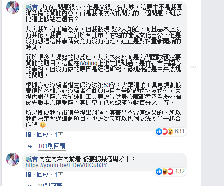 關於很多人提起的博愛座,其實本來反而是我們團隊預定要質詢的題目。這個在iVoting上也被提到過,是許多市民關心的事務。但沒有做的原因是經過研究,發現癥結是中央法規的問題。