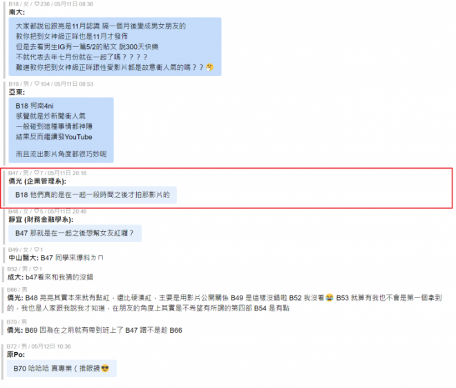 不僅如此,底下更疑似有閃亮亮的同學出面爆卦,「亮亮其實本來就有點紅,還比硬漢紅,主要是用影片公開關係」,證實兩人真的是在一起一段時間後才拍那影片的,還見過閃亮亮將黃包包帶到班上。