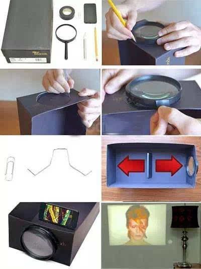 放大鏡+鞋盒=幻燈機,有了它,可以從容地在牆上看手機上的視頻,這真是個絕妙主意!