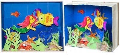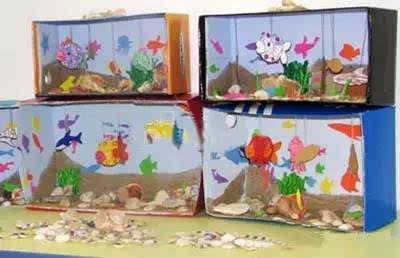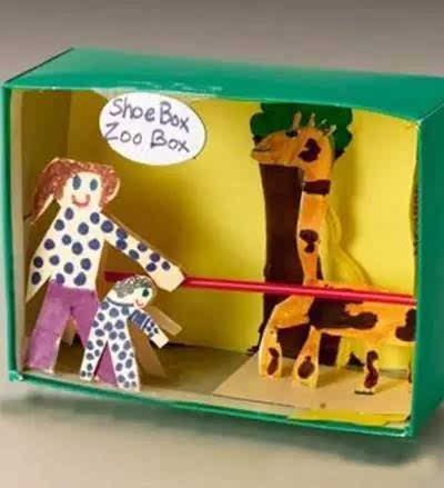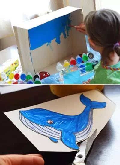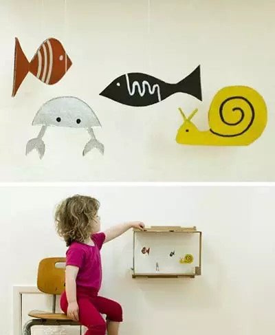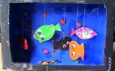 把鞋盒內部刷成藍色,將孩子畫筆下的各種形象剪下來,美麗的海底世界出爐。你可以用這樣的方法創建更多的場景!