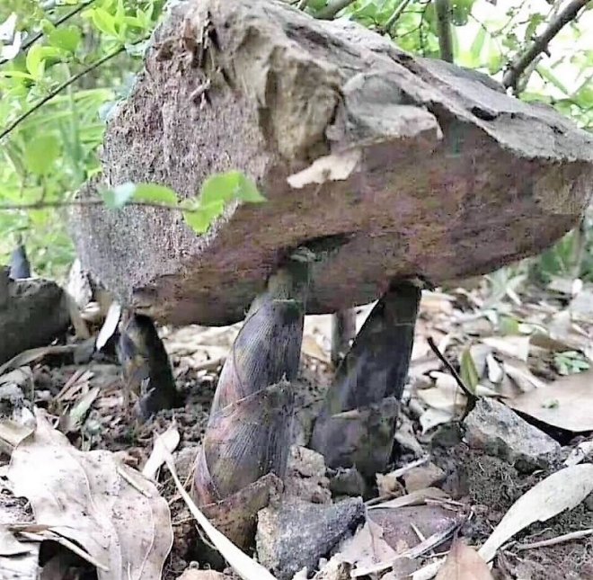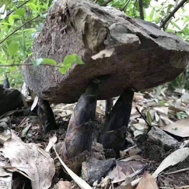 根據自由時報報導,嘉義縣番路鄉隙頂地區筍農賴澤祿,日前到孟宗竹竹園挖春筍時,赫然驚見一塊大石頭被3根孟宗竹筍扛起來的超神奇畫面!