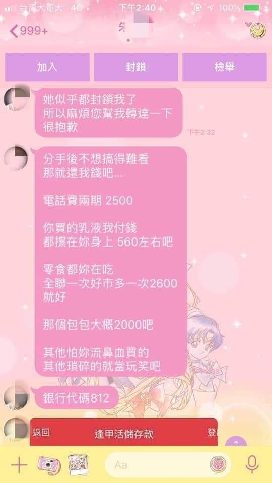已上是他和我閨蜜的對話,他不斷要求把之前送的東西轉成現金匯款還他…當初自願送的東西,瞬間都變成是吵鬧而逼得得送的…倒底???這是前男友和一位他的朋友的對話。