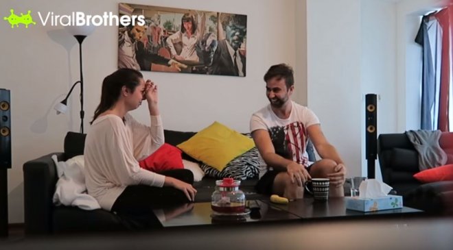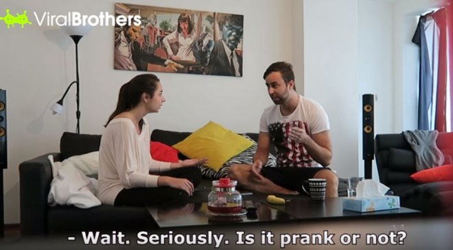 ▼男友開始不斷跳針,重複問著:「到底是不是惡作劇?」女友馬上回:「我已經四個月沒吃避孕藥了」男友像是瞬間明白了什麼,表情開始有點難受,質問女友:「等一下,講真的,這是不是在惡作劇?」女友也連忙否認。