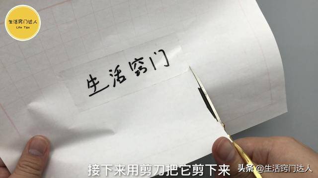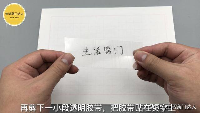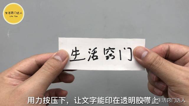 準備一張白紙,在紙上寫上需要的文字,再剪下一小段透明膠帶貼在文字上,這裡需要注意下,透明膠帶要比文字寬,將文字全部覆蓋在內。貼的時候需要牢固些不能留有絲毫縫隙,接著用剪刀沿著透明膠帶邊緣將它剪下來,只需要保留文字的,用力按壓讓文字能印在透明膠帶上;