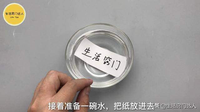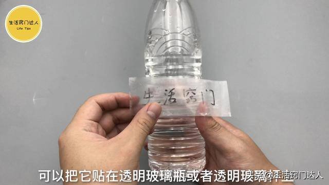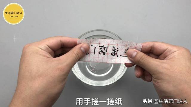 準備一碗水把紙放進去,浸泡五分鐘左右,等時間到後再拿出來,用手搓一搓,經過水浸泡過的紙很容易被搓掉的,完全搓完後透明膠帶還是很有黏性,可以把它貼在透明玻璃瓶或者透明玻璃杯上,有時候裝了透明的液體怕忘了,當作便利貼,也不用擔心會掉下來,家裡用玻璃瓶的東西可以試試。