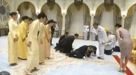 這些客人向瑪哈國王行泰國王室跪拜禮儀,他們跪倒在地,雙手合十放在地面,然後額頭貼近手部,全身幾乎都躺在地上,像睡在地板上。看著一屋子的人都跪倒在地,瑪哈國王早已習以為常。