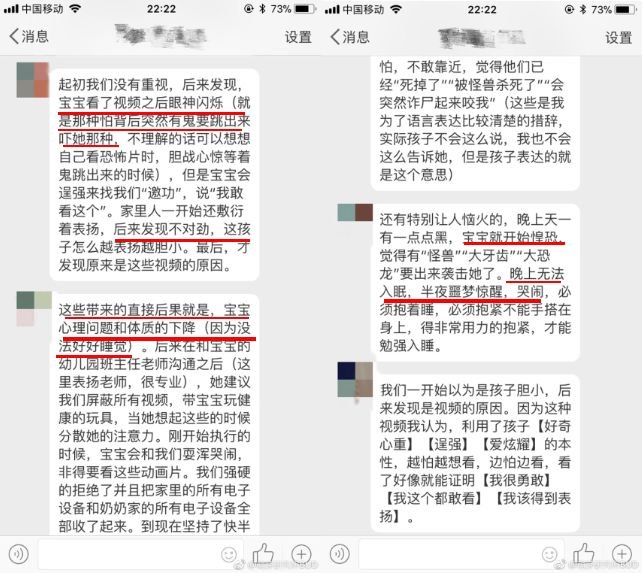還有一位媽媽@c小小滿說:我兒子才2歲,看過這些視頻後,半夜都會哭。