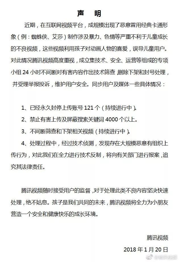 騰訊視頻發表聲明,禁止有害上傳及屏蔽搜索關鍵詞4000個以上不間斷篩查和下架相關視頻(持續進行中)。