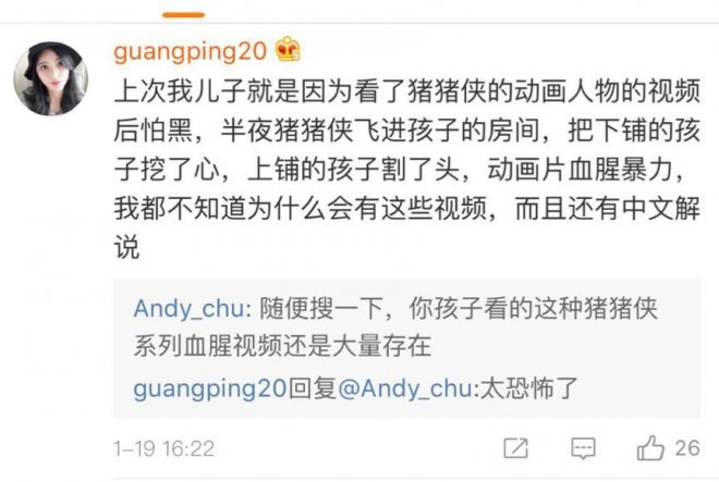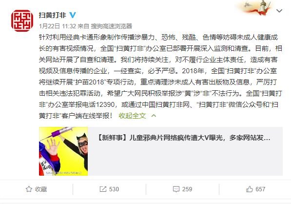 1月22日,全國「掃黃打非」辦公室官方微博發布消息稱,針對利用經典卡通形象製作傳播涉暴力、恐怖、殘酷、色情等妨礙未成人健康成長的有害視頻情況,全國「掃黃打非」辦公室已部署開展深入監測和清查。