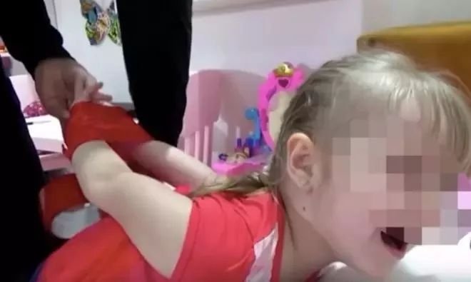 和國外視頻同樣的套路就這樣上演了,成人扮演「爸爸」拿著戒尺打女孩屁股,懲罰女童喊著「爸爸好痛啊」。
