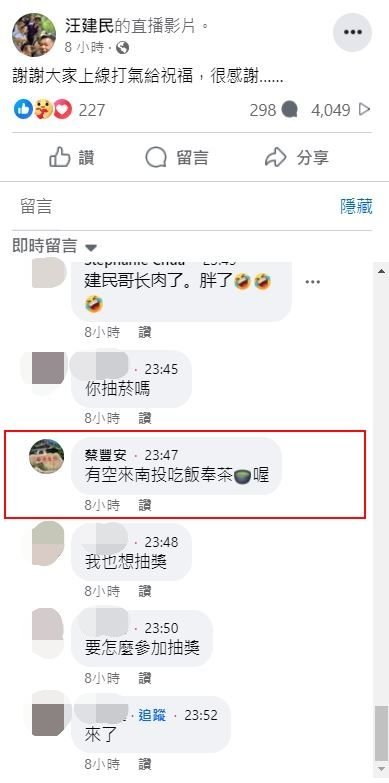 據《中時新聞網》報導,汪建民無預警直播,表示要兌現之前答應粉絲的抽獎活動,也藉此和關心他的朋友聊聊天。戴著鴨舌帽、黑框眼鏡的汪建民直播時聲音宏亮,雖然髮色灰白不少,肚子大了一圈,看來先前暴瘦的12公斤已慢慢恢復,也不少網友注意到他胖了,留言鼓勵他:「胖嘟嘟的建民哥可愛。」、「建民哥長肉了!」